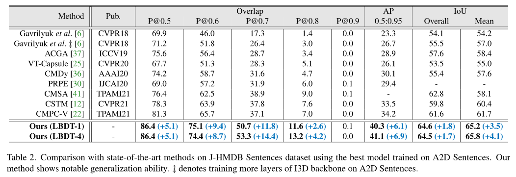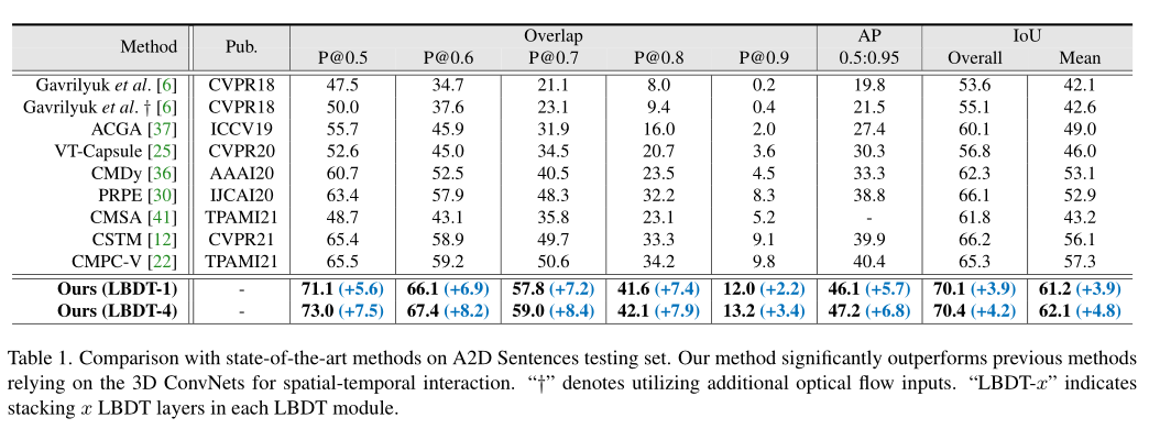 上表显示,在A2D Sentences测试集上,本文的方法大大优于以前的工作。与CSTM相比,本文的LBDT-1模型在AP、overall IoU和平均IoU上分别实现了5.7%、3.9%和3.9%的绝对提升,表明在编码阶段使用语言作为媒介进行显式时空交互优于在解码阶段使用3D convnet和隐式交互的现有方法。