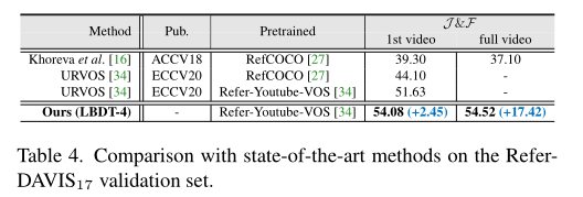 作者使用在Refer-YouTube VOS上训练的最佳模型,并在Refer-DAVIS17数据集上对其进行微调,结果如上表所示。