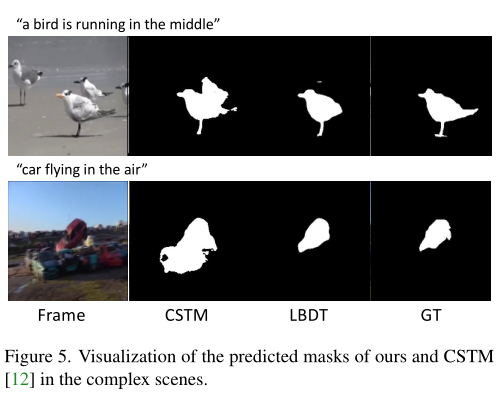 上图显示了本文的方法和CSTM在复杂场景中的预测。由于CSTM中的空间编码器缺乏运动信息,它倾向于在虚假对象(第二列)上生成mask。通过在编码阶段以语言为桥梁显式地进行时空交互,本文的方法可以获得引用对象(第三列)的精确mask。
