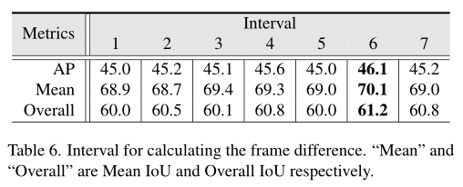 作者在上表中展示了区间值δ对计算帧差的影响。当时间间隔为6时,性能最佳,这实现了建模短动作和长动作的平衡。