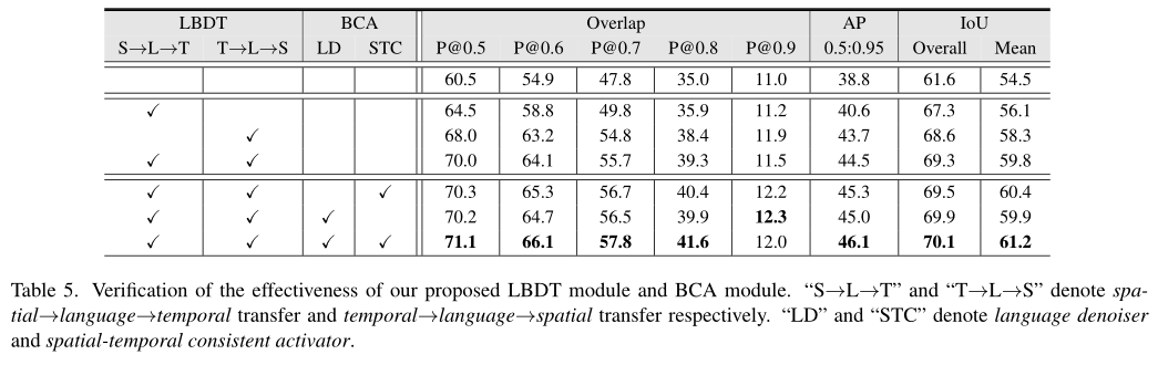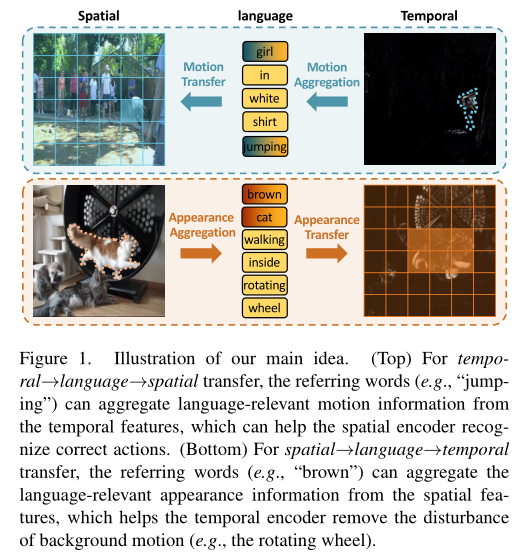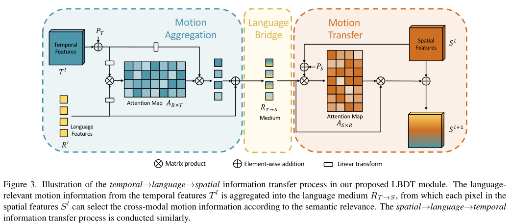 为此,作者提出了一种新的语言桥接双工传输(LBDT)模块,用于在编码阶段进行有效的时空交互。如上图所示,来自时间编码器的运动信息首先通过跨模态注意力聚合到参考词(referring words)。然后,空间编码器可以通过反向跨模态注意从参考词中获得与语言相关的运动线索,这有助于通过识别正确的动作来识别参考对象(上图顶部)。