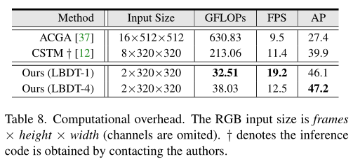 上表中,作者比较了本文的方法和以前的方法的计算开销。在不依赖3D ConvNet的情况下,本文的模型在消耗约7×更少GFLOP和更小输入量的同时,显著优于现有方法。