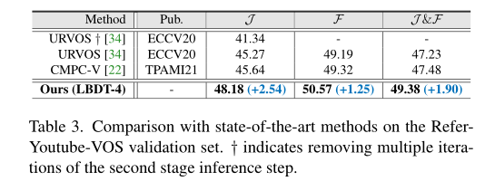 作者还对新提出的Refer-YouTube-VOS基准进行了实验,该基准具有更丰富的对象类别和更密集的注释帧。如上表所示,本文的方法在J&F指标上分别比URVOS和CMPC-V好2.15%和1.90%,这表明本文的方法即使在复杂场景中也能表现良好。