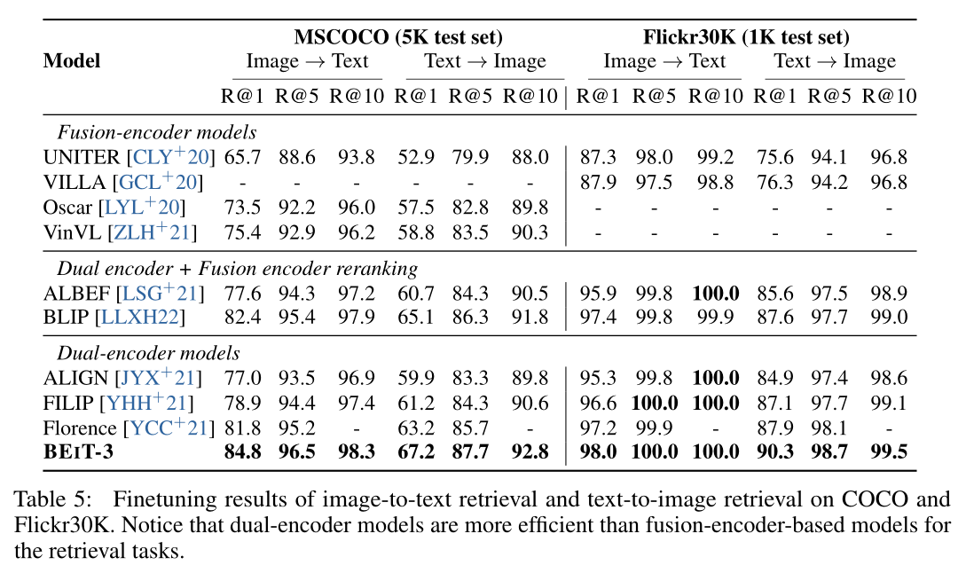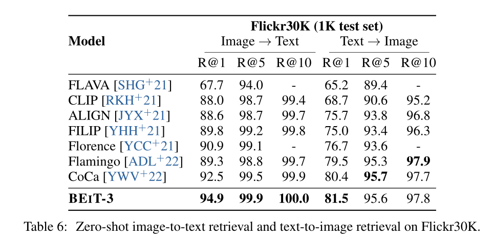 如上图所示,统一的架构使 BEIT-3 能够支持广泛的下游任务。例如,BEIT-3 可以用作各种视觉任务的图像主干,包括图像分类、对象检测、实例分割和语义分割。它还可以微调为双编码器,用于高效的图像-文本检索,以及用于多模态理解和生成任务的融合模型。