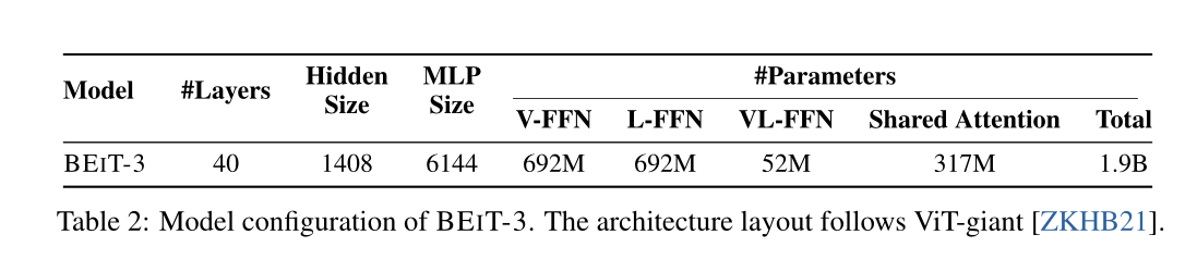 BEIT-3 是继 ViTgiant搭建之后的巨型基础模型。如上表所示,该模型由一个 40 层的 Multiway Transformer 组成,具有 1408 的隐藏大小、6144 的中间大小和 16 个注意力头。所有层都包含视觉专家和语言专家。视觉语言专家也采用于前三个 Multiway Transformer 层。自注意力模块在不同的模态中共享。 BEIT-3总共由1.9B个参数组成,其中视觉专家参数692M,语言专家参数692M,视觉语言专家参数52M,共享自注意力模块参数317M。请注意,当模型用作视觉编码器时,仅激活与视觉相关的参数(即,与 ViT-giant 相当的大小;大约 1B)。