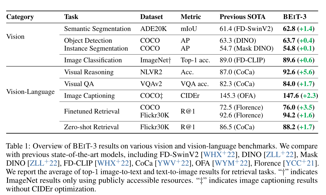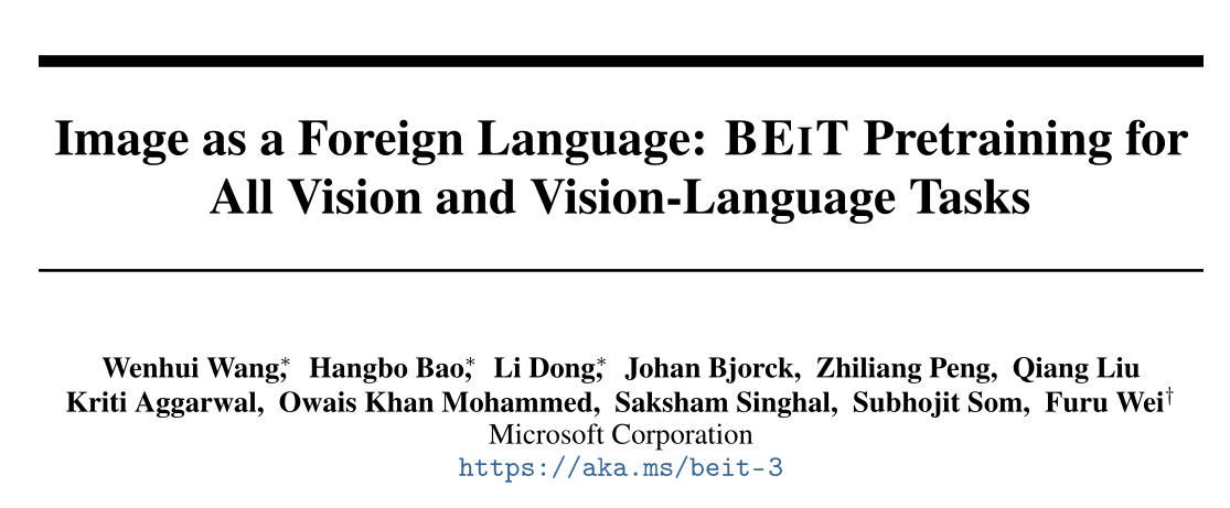 语言、视觉和多模态预训练的大融合正在出现。在这项工作中,作者引入了一个通用的多模态基础模型 BEIT-3,它在视觉和视觉语言任务上都实现了最先进的迁移性能。具体来说,作者从三个方面推进大融合:骨干架构、预训练任务和模型扩展。作者为通用建模引入了 Multiway Transformers,其中模块化架构支持深度融合和特定于模态的编码。基于共享主干,作者以统一的方式对图像(Imglish)、文本(English)和图像-文本对(“parallel sentences”)进行掩码“语言”建模。实验结果表明,BEIT-3 在对象检测 (COCO)、语义分割 (ADE20K)、图像分类 (ImageNet)、视觉推理 (NLVR2)、视觉问答 (VQAv2)、图像字幕方面获得了最先进的性能(COCO)和跨模态检索(Flickr30K,COCO)。