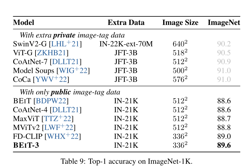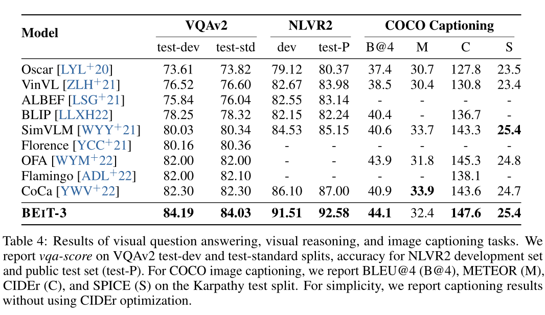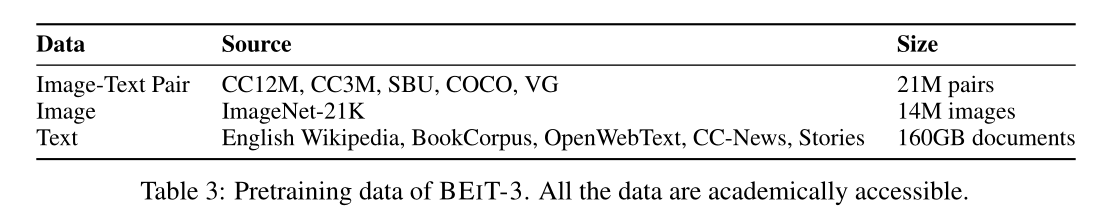BEIT-3 在上表中显示的单模态和多模态数据上进行了预训练。对于多模态数据,从五个公共数据集中收集了大约 1500 万张图像和 2100 万张图文对:Conceptual 12M (CC12M)、Conceptual Captions (CC3M) 、SBU Captions (SBU) 、COCO 和视觉基因组 (VG) 。对于单模态数据,使用来自 ImageNet-21K 的 14M 图像和来自英语 Wikipedia、BookCorpus 、OpenWebText3、CC-News 和 Stories 的 160GB 文本语料库。