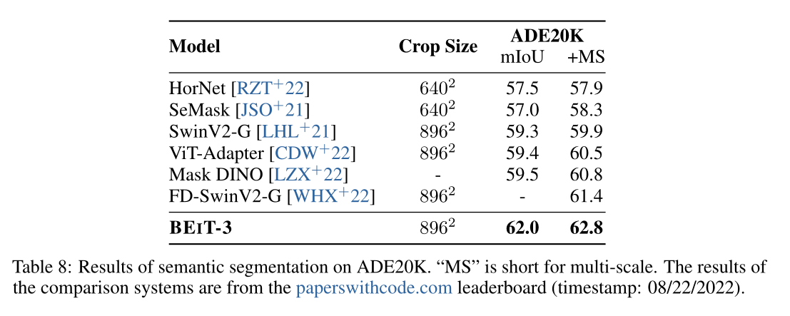 如上图和上表所示,BEIT-3 在广泛的视觉和视觉语言任务中实现了最先进的迁移性能。作者在广泛的下游任务和数据集上评估 BEIT-3,即对象检测 (COCO)、实例分割 (COCO)、语义分割 (ADE20K)、图像分类 (ImageNet)、视觉推理 (NLVR2)、视觉问答 (VQAv2) ,图像字幕(COCO)和跨模态检索(Flickr30K,COCO)。具体来说,尽管作者只使用公共资源进行预训练和微调,但本文的模型优于以前的强大基础模型。该模型也比专门的模型获得了更好的结果。此外,BEIT-3 不仅在视觉语言任务上表现出色,而且在视觉任务(如对象检测和语义分割)上也表现出色。