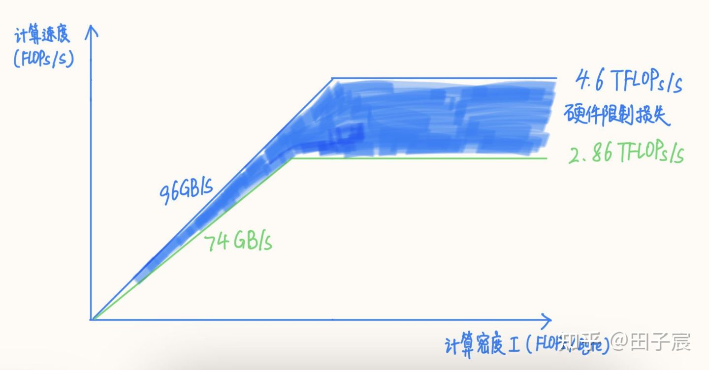 修正了实测峰值算力和内存带宽后的 RoofLine 模型,蓝色填充部分为硬件限制带来的损失