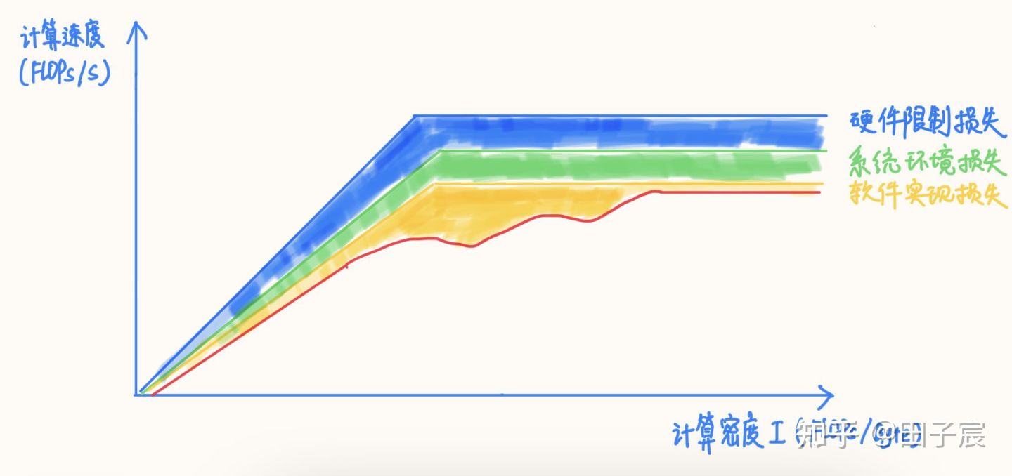 RoofLine 模型各种性能损失示意图,图中曲线不代表真实比例