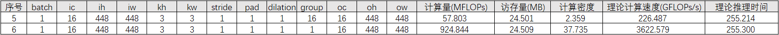 下面这个栗子更明显,OP5 和 OP6 的区别仅仅是一个是 DepthWise Conv,一个是普通 Conv,其他参数没有变化。按照我们之前的直观感受,Conv 换成 DepthWise Conv 应该会更快,但实际上两者的推理时间是差不多的(这组参数也是当年我用过的【手动捂脸):