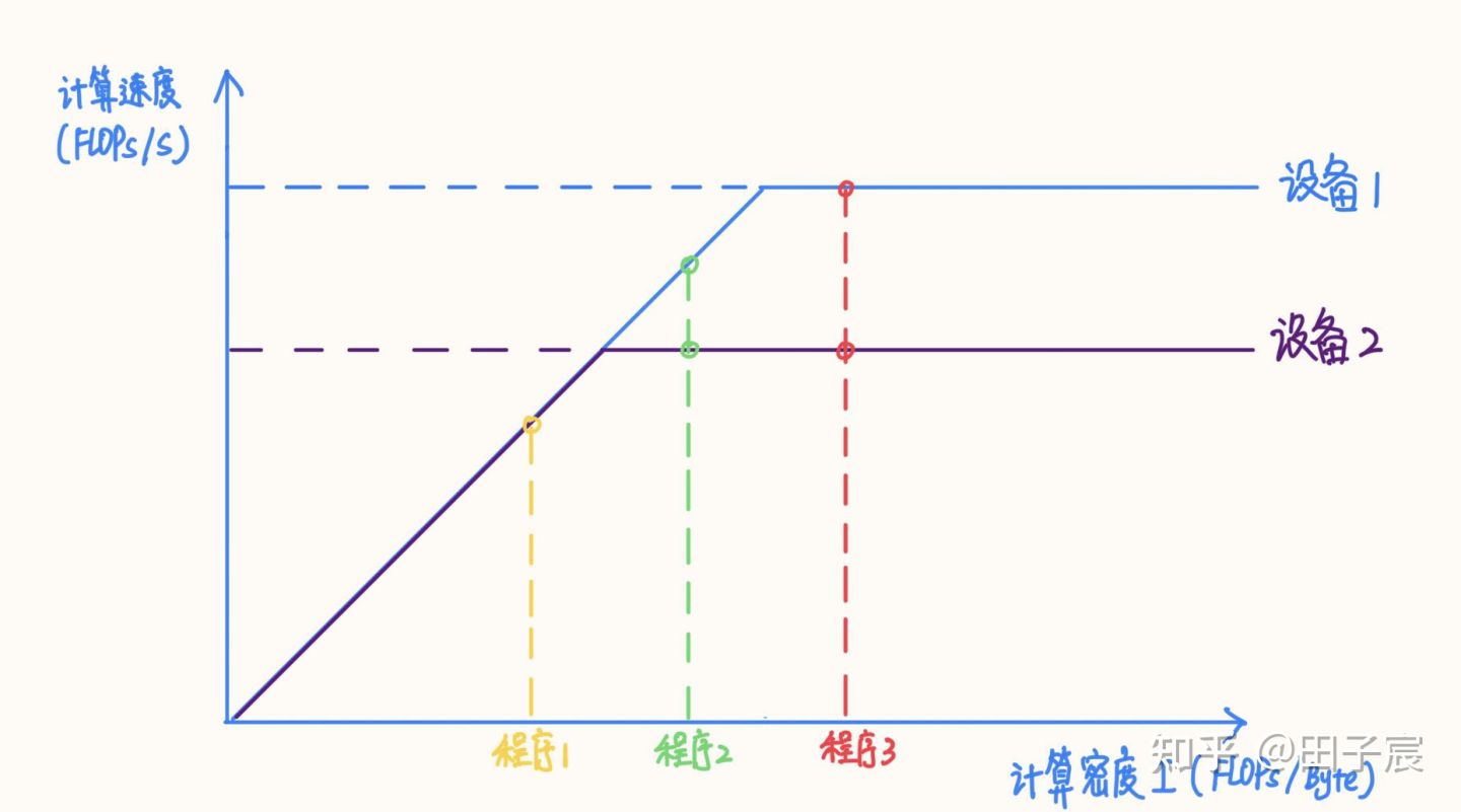 在不同设备上,同一个程序的性质可能发生变化。例如上图中的程序2,在算力稍弱的设备2上属于计算密集型程序,而在算力较强的设备1上就属于访存密集型程序了(感谢评论区指正)。如果想要充分发挥设备1的性能,应当适当加大程序的计算密度(比如到程序3的位置)。