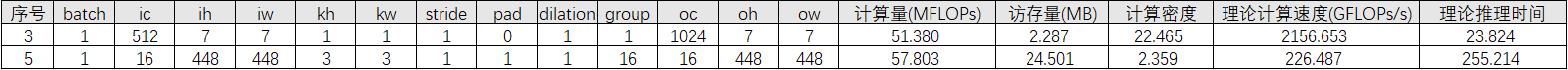 再举两个例子强化一下,首先看这两个卷积,他们的计算量差不多,但是因为都在访存密集区,OP3 的访存量远低于 OP5,其推理也更快: