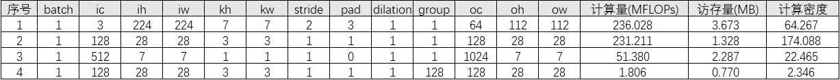 可以看到,不同参数下卷积算子的计算密度有很大的差异。第 4 个算子 Depthwise Conv 计算密度仅有 2.346,在当下的很多设备上都属于访存密集型算子。