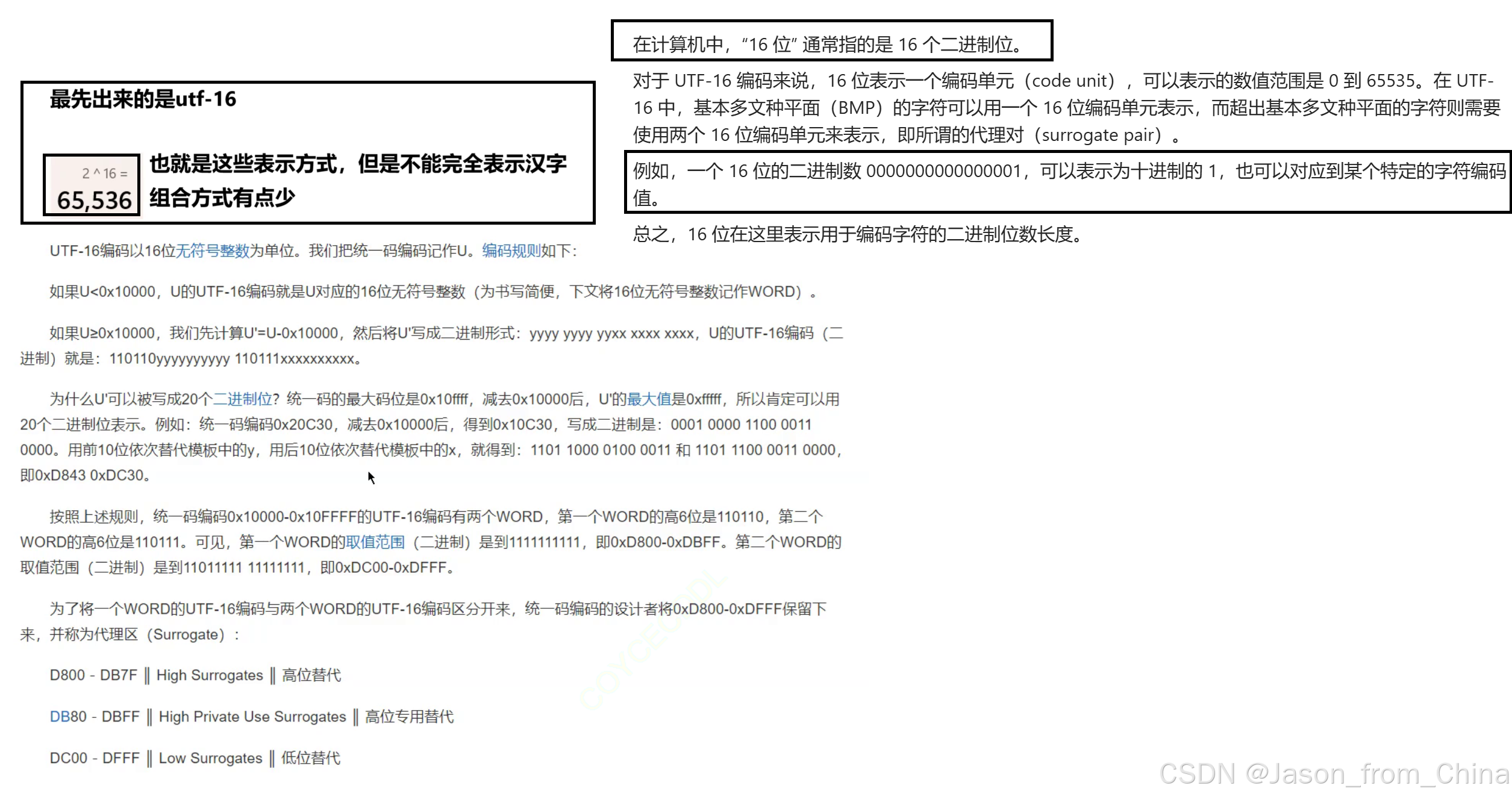 - 但是UTF-16的弊端就是它的表述方式和组合方式很少,如果以中国举例的话UTF-16并不能把中国的汉字完全的映射出来