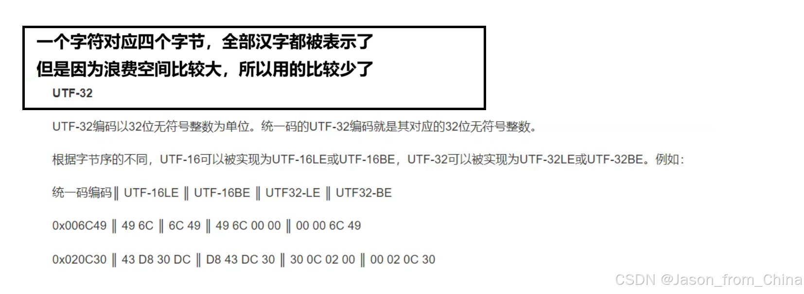- UTF-32的出现缓解了UTF-16的尴尬,但是也不是经常使用,因为它是一个字符对应4个字节,这样就会导致比较浪费空间