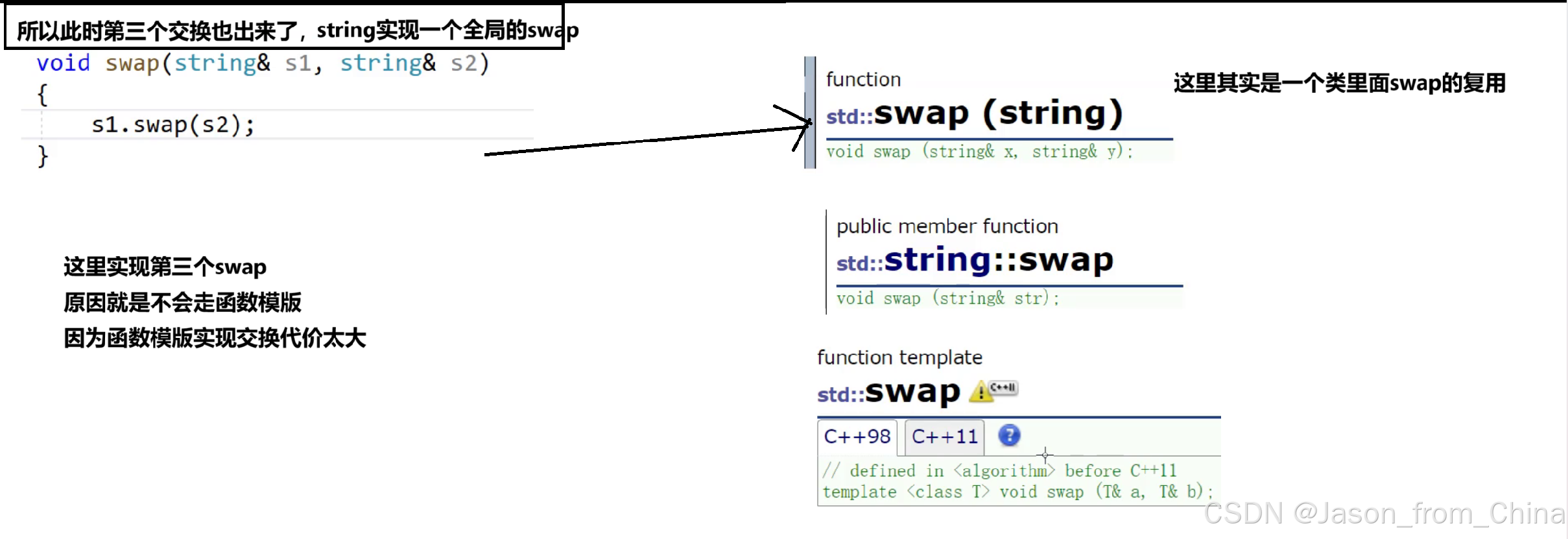 3,所以我们为了使用时候不自己使用函数模版,往往是自己实现一个全局swap函数,并且重载为友元函数- 这里我们实现代码的时候可以直接使用复用,从而实现s1,s2的交换