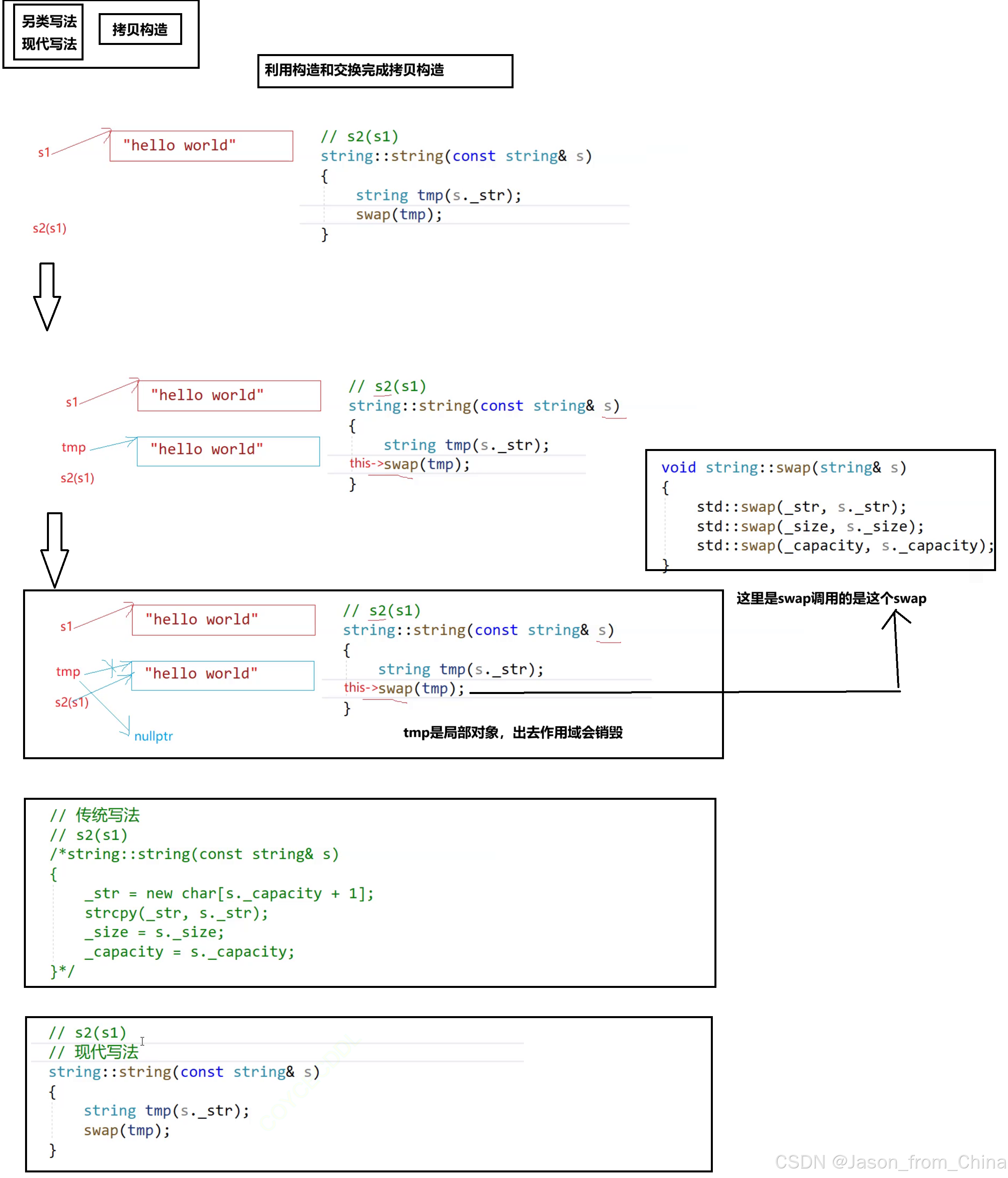 //拷贝构造的实现,新版本的实现 string::string(const string& s) { string tmp(s._str); swap(tmp); }代码解释: