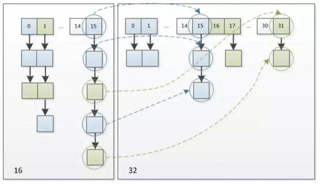 因此,我们在扩充 HashMap 的时候,不需要像 JDK1.7 的实现那样重新计算 hash,只需要看看原来的 hash 值新增的那个 bit 是 1 还是 0 就好了,是 0 的话索引没变,是 1 的话索引变成 “原索引 + oldCap”,可以看看下图为 16 扩充为 32 的 resize 示意图: