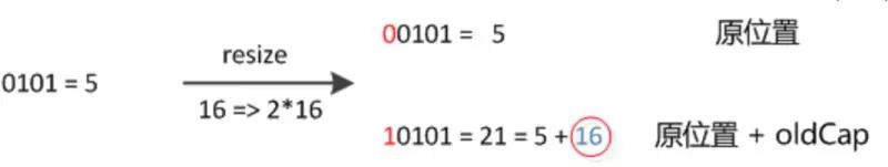 元素在重新计算 hash 之后,因为 n 变为 2 倍,那么 n-1 的 mask 范围在高位多 1bit(红色),因此新的 index 就会发生这样的变化: