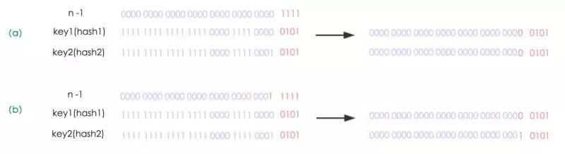 我们下面来解释一下 Java8 的扩容机制是怎么做到的?n 为 table 的长度,图(a)表示扩容前的 key1 和 key2 两种 key 确定索引位置的示例,图(b)表示扩容后 key1 和 key2 两种 key 确定索引位置的示例,其中 hash1 是 key1 对应的哈希与高位运算结果。