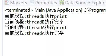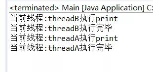 public class Main{ public static void main(String[] args) { Object lock = new Object(); Thread threadA = new Thread(new Runnable() { @Override public void run() { synchronized (lock) { try { lock.wait(); } catch (InterruptedException e) { // TODO Auto-generated catch block e.printStackTrace(); } print(); } } }); Thread threadB = new Thread(new Runnable() { @Override public void run() { synchronized (lock) { print(); lock.notifyAll(); } } }); threadA.setName("threadA"); threadB.setName("threadB"); threadA.start(); threadB.start(); } public static void print() { System.out.println("当前线程:"+Thread.currentThread().getName()+"执行print"); try { Thread.sleep(1000); } catch (InterruptedException e) { // TODO Auto-generated catch block e.printStackTrace(); } System.out.println("当前线程:"+Thread.currentThread().getName()+"执行完毕"); } }