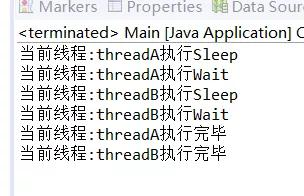 public class Main{ public static void main(String[] args) { Thread threadA = new Thread(new ThreadA()); Thread threadB = new Thread(new ThreadB()); threadA.setName("threadA"); threadB.setName("threadB"); threadA.start(); threadB.start(); } public static synchronized void print() { System.out.println("当前线程:"+Thread.currentThread().getName()+"执行Sleep"); try { Thread.sleep(1000); } catch (InterruptedException e) { // TODO Auto-generated catch block e.printStackTrace(); } System.out.println("当前线程:"+Thread.currentThread().getName()+"执行Wait"); try { Main.class.wait(1000); } catch (InterruptedException e) { // TODO Auto-generated catch block e.printStackTrace(); } System.out.println("当前线程:"+Thread.currentThread().getName()+"执行完毕"); } } class ThreadA implements Runnable{ @Override public void run() { // TODO Auto-generated method stub Main.print(); } } class ThreadB implements Runnable{ @Override public void run() { // TODO Auto-generated method stub Main.print(); } }