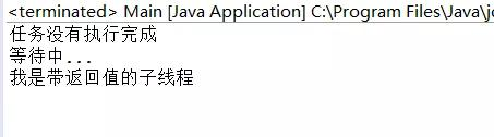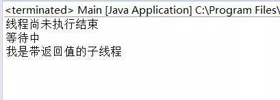 public class Main implements Callable<String>{ @Override public String call() throws Exception { // TODO Auto-generated method stub String str = "我是带返回值的子线程"; return str; } public static void main(String[] args) throws InterruptedException, ExecutionException { ExecutorService newCacheThreadPool = Executors.newCachedThreadPool(); Future<String> future = newCacheThreadPool.submit(new Main()); if(!future.isDone()) { System.out.println("线程尚未执行结束"); } System.out.println("等待中"); Thread.sleep(300); System.out.println(future.get()); newCacheThreadPool.shutdown(); } }