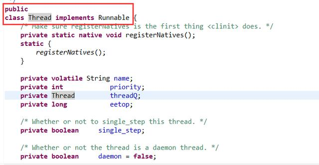 通过上述源码图,不难看出,Thread是一个类,而Runnable是一个接口,Runnable接口中只有一个没有实现的run方法,可以得知,Runnable并不能独立开启一个线程,而是依赖Thread类去创建线程,执行自己的run方法,去执行相应的业务逻辑,才能让这个类具备多线程的特性。
