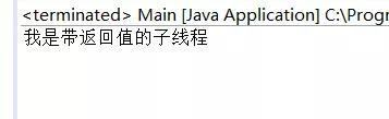 public class Main implements Callable<String>{ @Override public String call() throws Exception { // TODO Auto-generated method stub String str = "我是带返回值的子线程"; return str; } public static void main(String[] args) { FutureTask<String> task = new FutureTask<String>(new Main()); new Thread(task).start(); try { if(!task.isDone()) { System.out.println("任务没有执行完成"); } System.out.println("等待中..."); Thread.sleep(3000); System.out.println(task.get()); } catch (InterruptedException | ExecutionException e) { // TODO Auto-generated catch block e.printStackTrace(); } } }