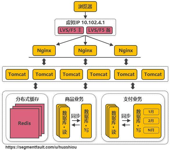 此处需要注意的是,上图中从Nginx层到Tomcat层这样画并不代表全部Nginx都转发请求到全部的Tomcat,在实际使用时,可能会是几个Nginx下面接一部分的Tomcat,这些Nginx之间通过keepalived实现高可用,其他的Nginx接另外的Tomcat,这样可接入的Tomcat数量就能成倍的增加。