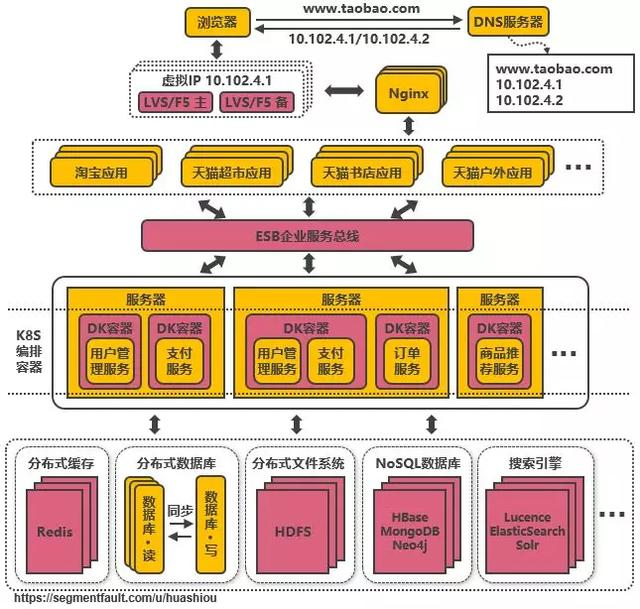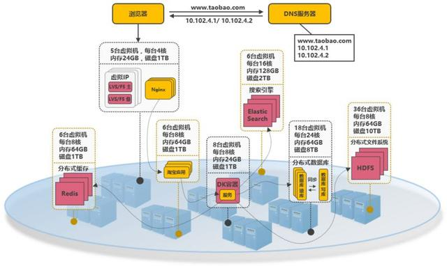 以淘宝作为例子。在网站最初时,应用数量与用户数都较少,可以把Tomcat和数据库部署在同一台服务器上。浏览器往www.taobao.com发起请求时,首先经过DNS服务器(域名系统)把域名转换为实际IP地址10.102.4.1,浏览器转而访问该IP对应的Tomcat。
