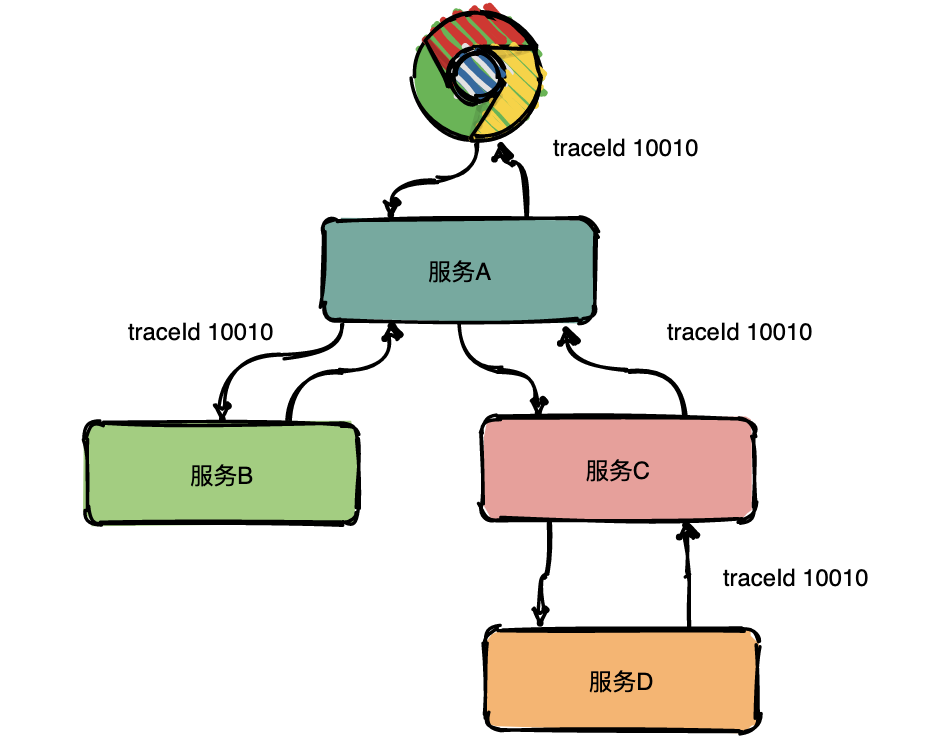 图中一条完整的链路是:chrome -> 服务A -> 服务B -> 服务C -> 服务D -> 服务E -> 服务C -> 服务A -> chrome。服务间经过的局部链路构成了一条完整的链路,其中每一条局部链路都用一个全局唯一的traceid来标识。