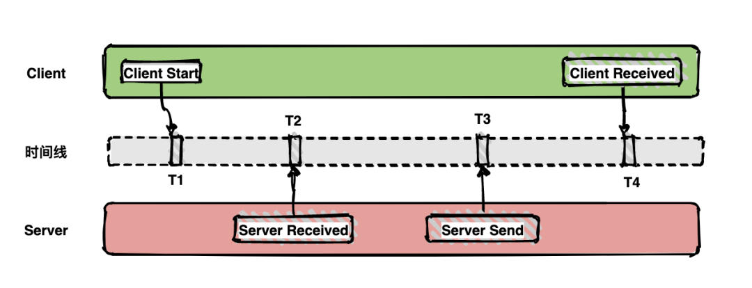 如下面的图表示从客户端调用服务端的一次完整过程。如果要计算一次调用的耗时,只需要将客户端接收的时间点减去客户端开始的时间点,也就是图中时间线上的T4 - T1。如果要计算客户端发送网络耗时,也就是图中时间线上的T2 - T1,其他类似可计算。
