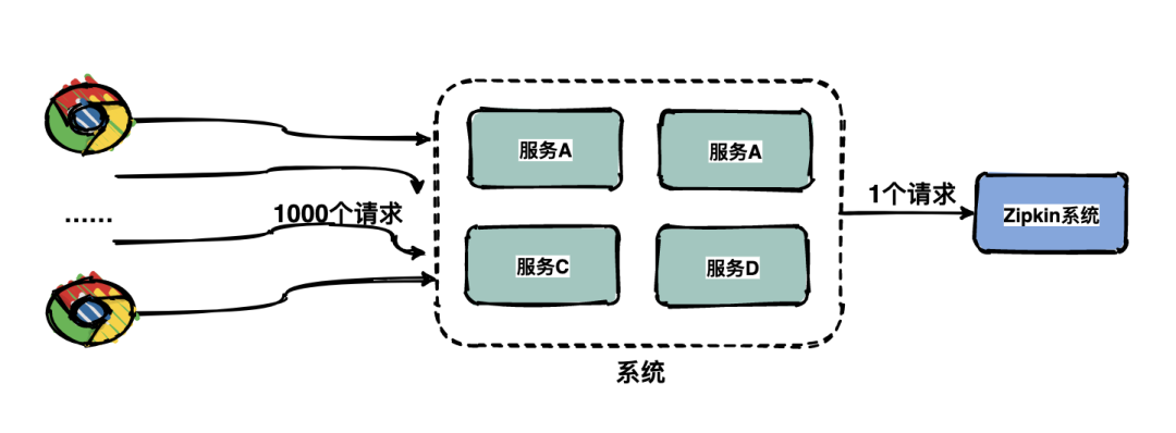 由于每一个请求都会生成一个链路,为了减少性能消耗,避免存储资源的浪费,dapper并不会上报所有的span数据,而是使用采样的方式。举个例子,每秒有1000个请求访问系统,如果设置采样率为1/1000,那么只会上报一个请求到存储端。