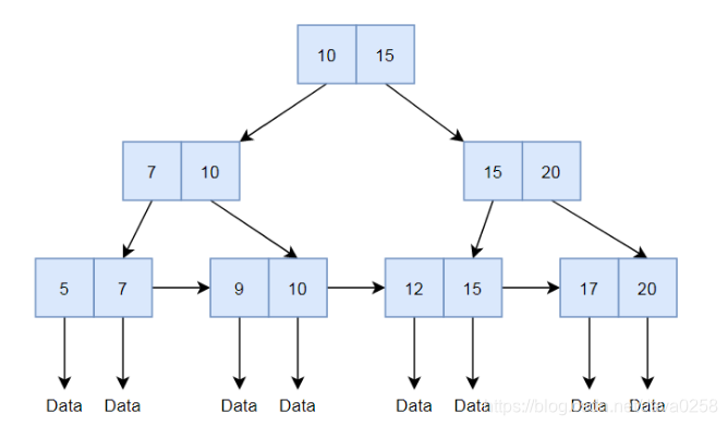 我们来仔细看下B+树的结构,它不光有常规树的分支结构,底部还有一个由叶子节点组成链表。
