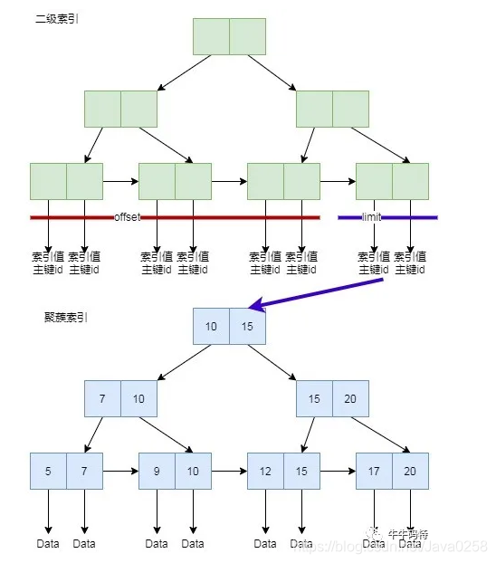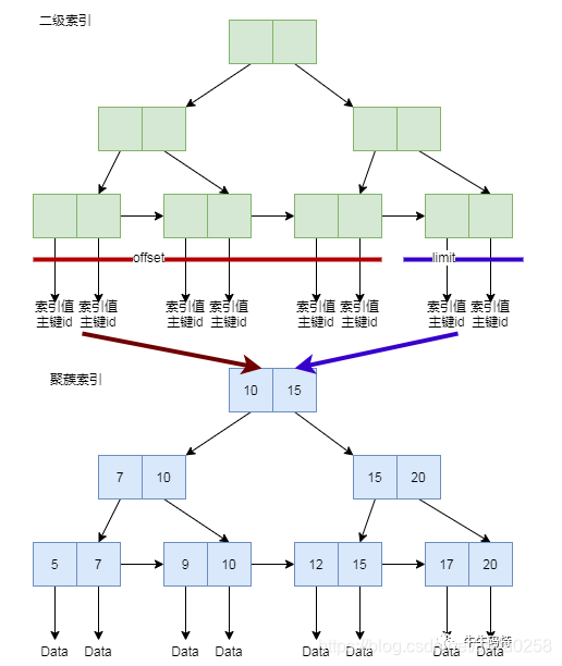 通过二级索引age,我们只能找到对应的起始节点,但无法通过树结构过滤掉10000个节点,再获取10个节点,因为我们无法知道某个子树下有多少数据,就无法通过分支进行排除。