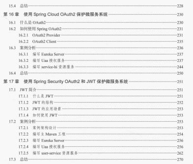 第17章,介绍了如何在Spring Cloud微服务系统中使用Spring Cloud OAuth2和JWT来保护微服务的系统安全