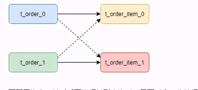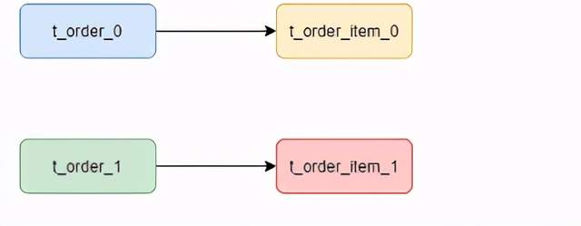 而配置绑定表关系后再进行关联查询时,只要对应表分片规则一致产生的数据就会落到同一个库中,那么只需 t_order_0 和 t_order_item_0 表关联即可。