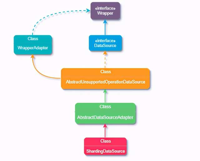 其中 CommonDataSource 是定义数据源的根接口这很好理解,而 Wrapper 接口则是拓展 JDBC 分片功能的关键。