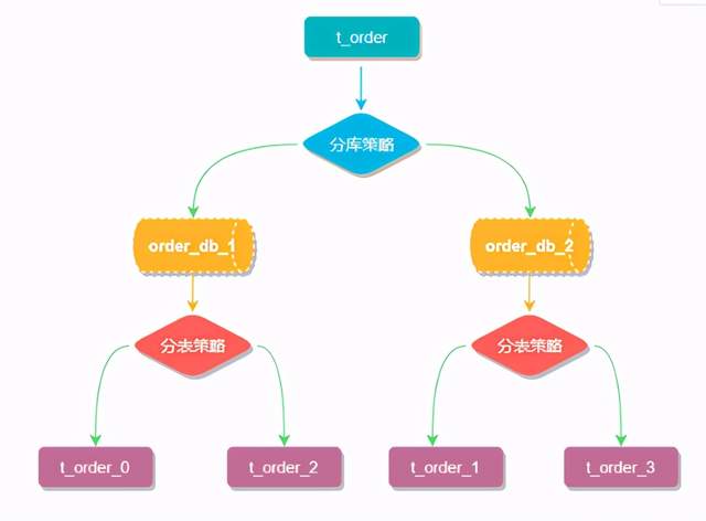 数据节点是分库分表中一个不可再分的最小数据单元(表),它由数据源名称和数据表组成,例如上图中 order_db_1.t_order_0、order_db_2.t_order_1 就表示一个数据节点。