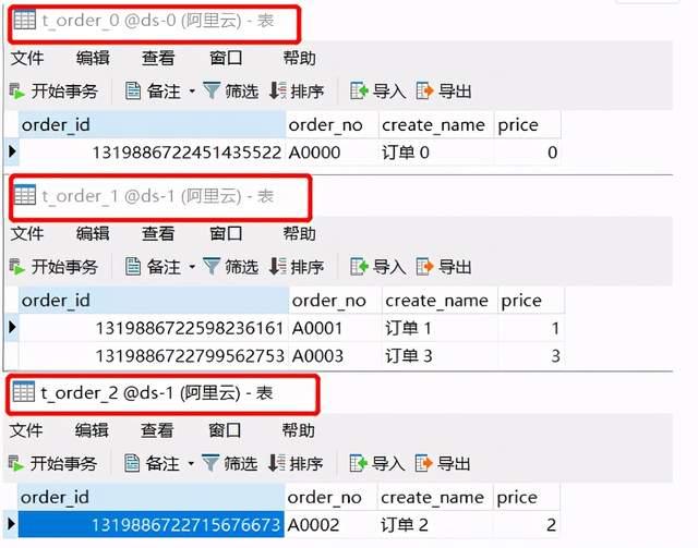 看到订单记录被成功分散到了不同的库表中, order_id 字段也自动生成了主键ID,基础的分片功能就完成了。