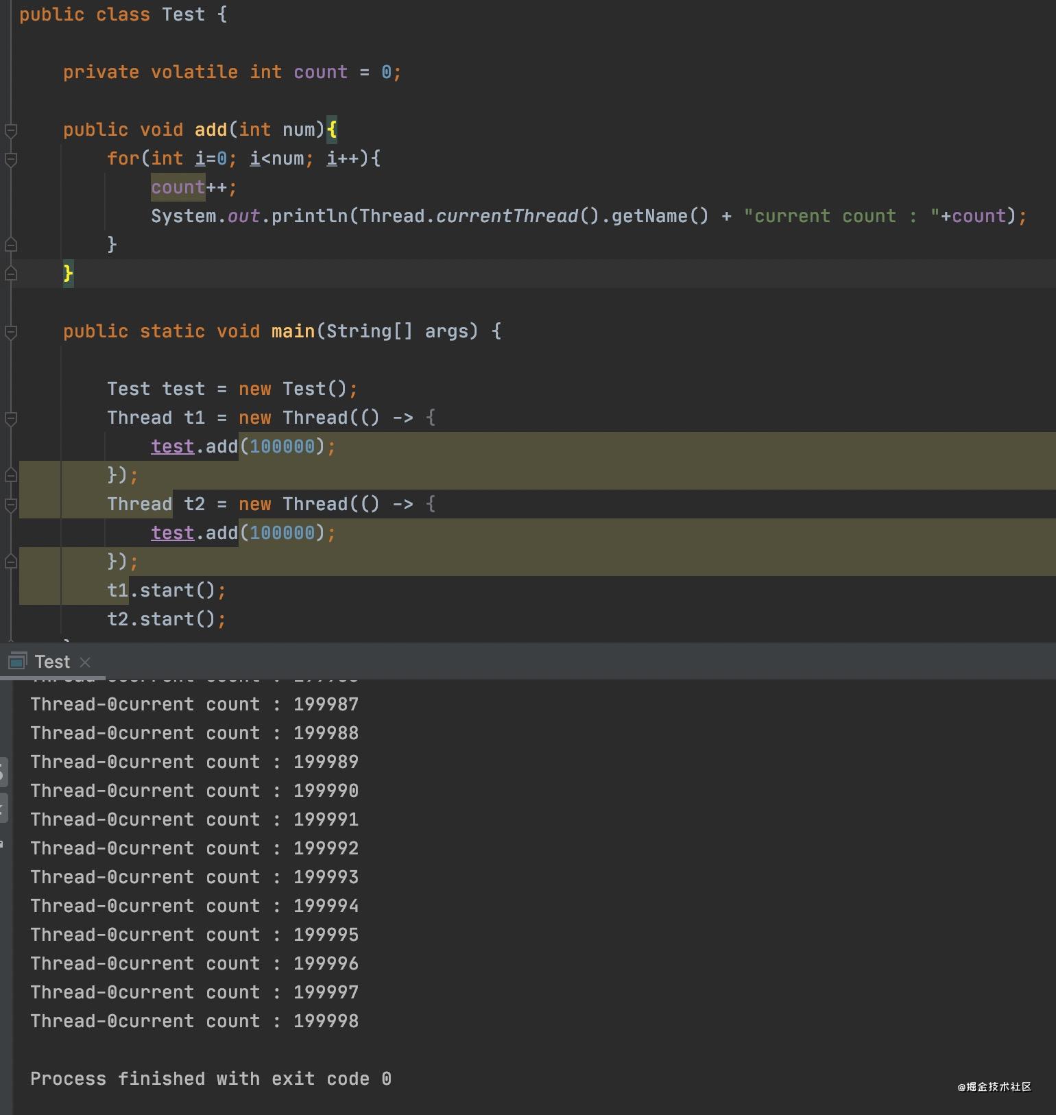 下面我们再用一段代码来验证一下多线程工作内存的可见性。下面的代码,每执行一次 add() 方法,都会循环num次 count++ 操作。在主方法中我们创建了两个线程,每个线程调用一次 add(100000) 方法,我们来想一想执行完得到的结果应该是多少呢?