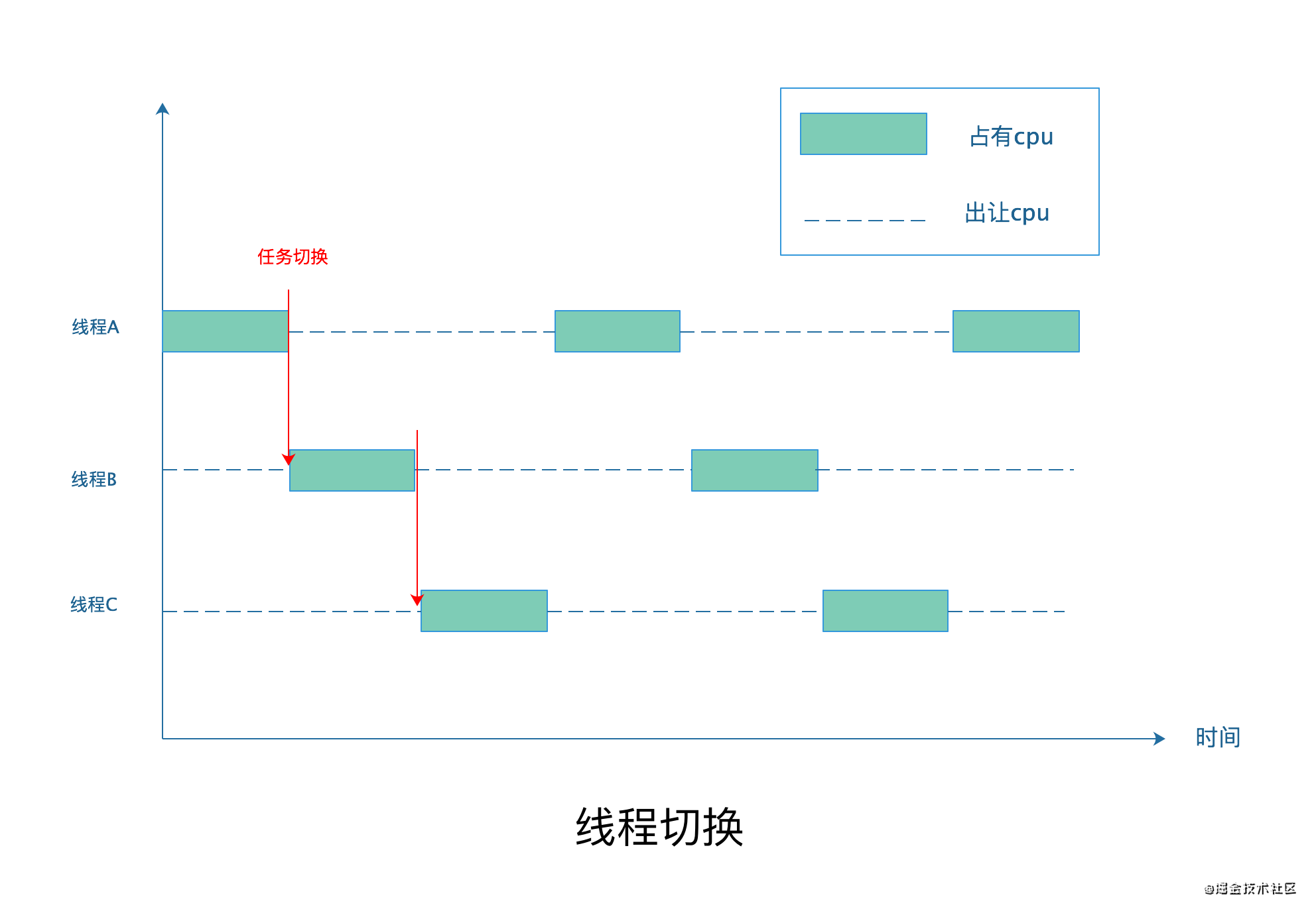 当前的操作系统执行基本是基于“时间片”来执行,即当有多个进程需要获取CPU的执行操作时,CPU采用时间片轮转法并发的执行,即CPU会允许某个进程执行一小段时间,例如 100 毫秒,过了 100 毫秒操作系统就会重新选择一个进程来执行(我们称为“任务切换”),如下图: