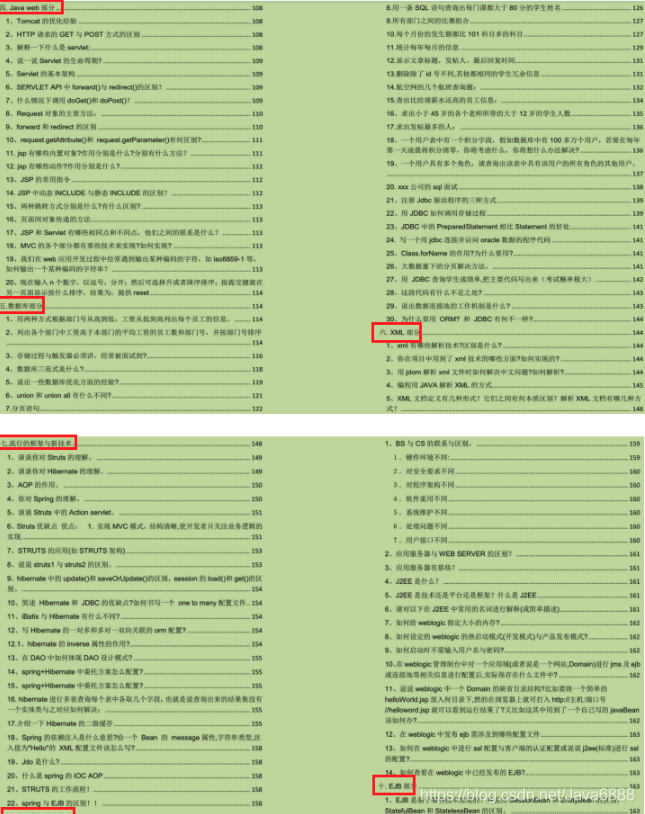 像这次Aliyun就比较重视基础,所以关于Java基础这一块的话,去刷这份<java面试宝典>有关基础这块的问题都有:java基础+算法与编程+html&JavaScript&ajax+Javaweb+数据库+XML+流行的框架与新技术+软件工程与设计模式+j2ee+EJB+webservice