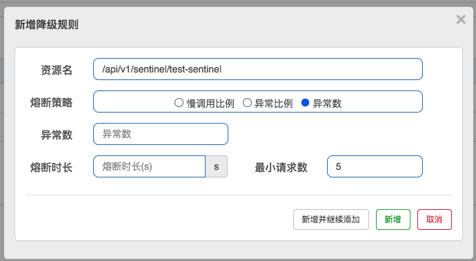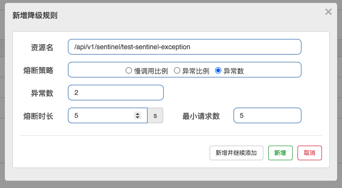 异常数 :当单位统计时长内的异常数目超过阈值之后会自动进行熔断。