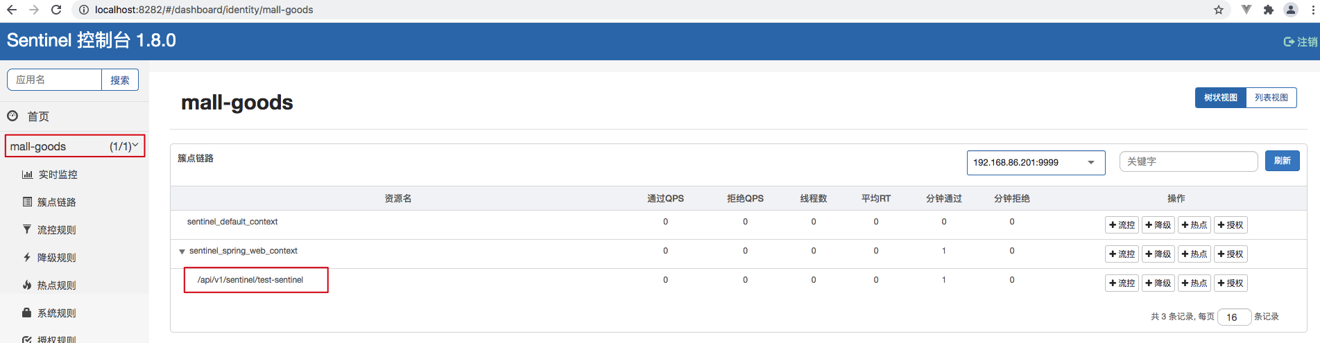 我们可以看到控制台已经有 mall-goods 服务了。而且我们刚刚请求的接口这里也有了。这说明Sentinel 默认会把接口直接当成一个资源。既然是这样,接下来就对这个请求