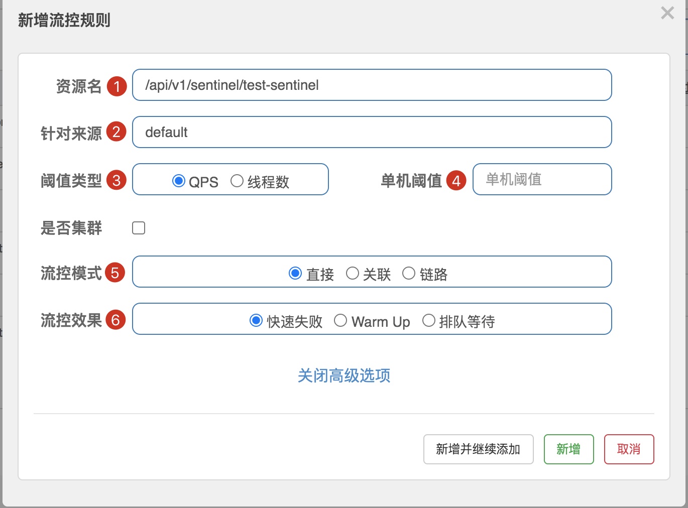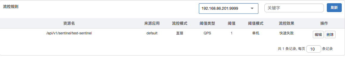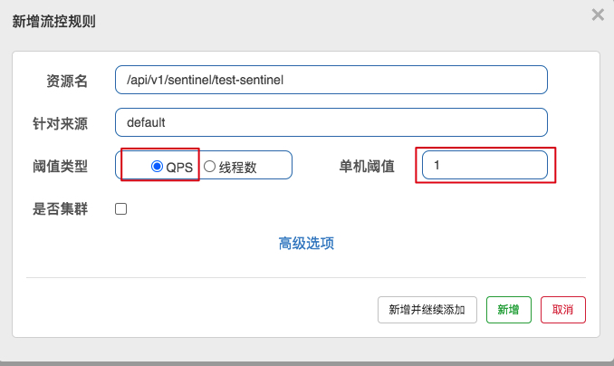 阈值类型:QPS,单机阈值:1,流控模式:直接,流控效果:快速失败