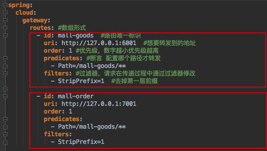 一个routes下可以有多个上面的配置,上面一个配置可以理解成一个微服务节点。如果有多个微服务需要转发那么就在routes下多配置几个,示例