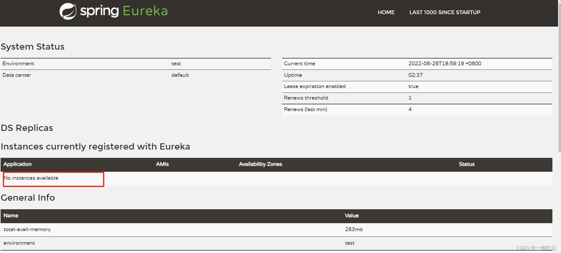 - 启动后可以访问服务注册中心主页。地址 "http://localhost:8763/"